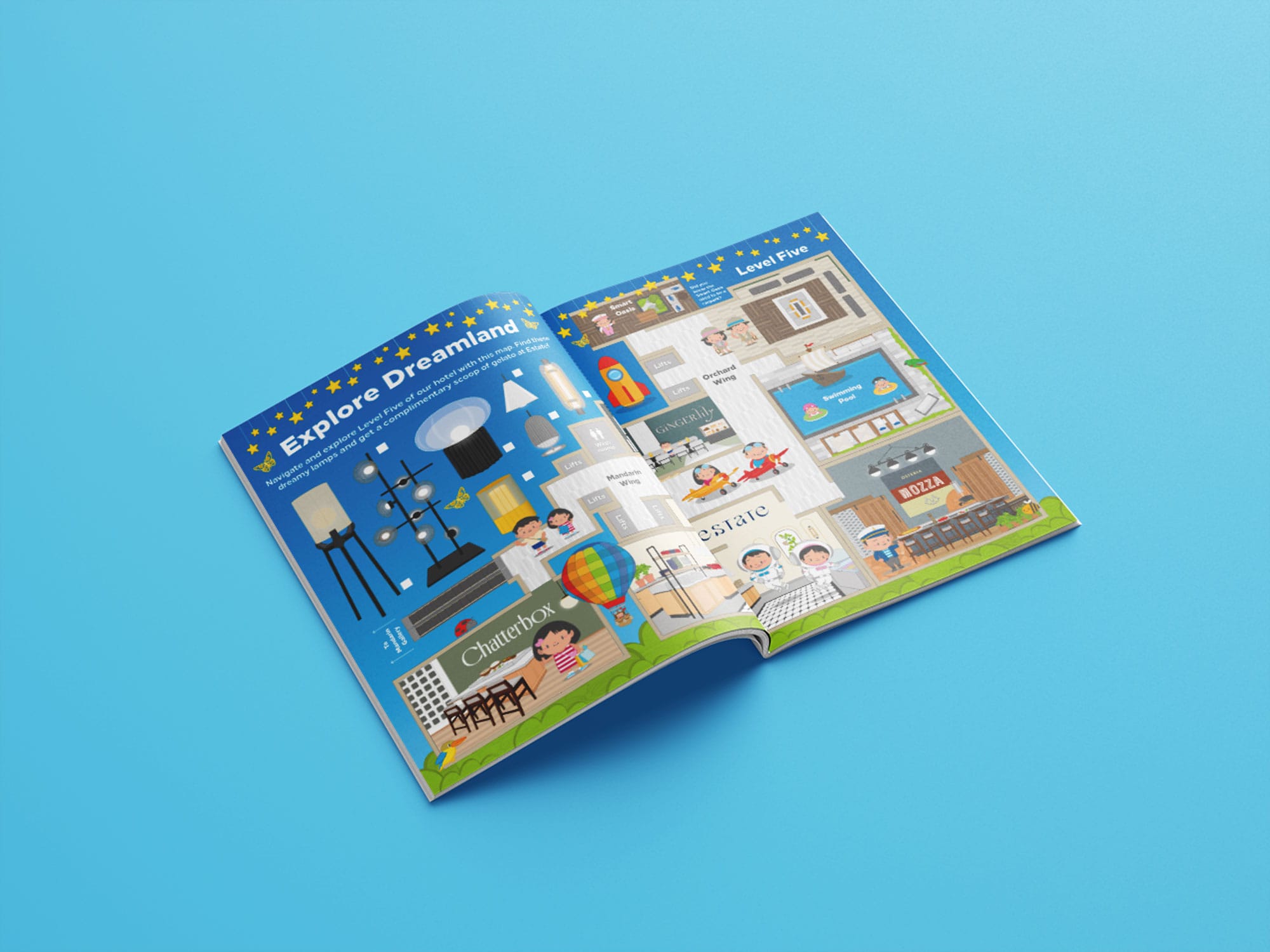 Age Appropriate Design: The illustrated map of the hotel lobby features a playful scavenger hunt that encourages kids to explore the area and find unique lamps and light fixtures throughout the floor. Once they locate all the items, they can redeem a free ice cream at the all-day dining restaurant. This activity is designed with visual simplicity in mind, making it ideal for children aged 5 to 10. It offers a fun way to promote exploration on the property.