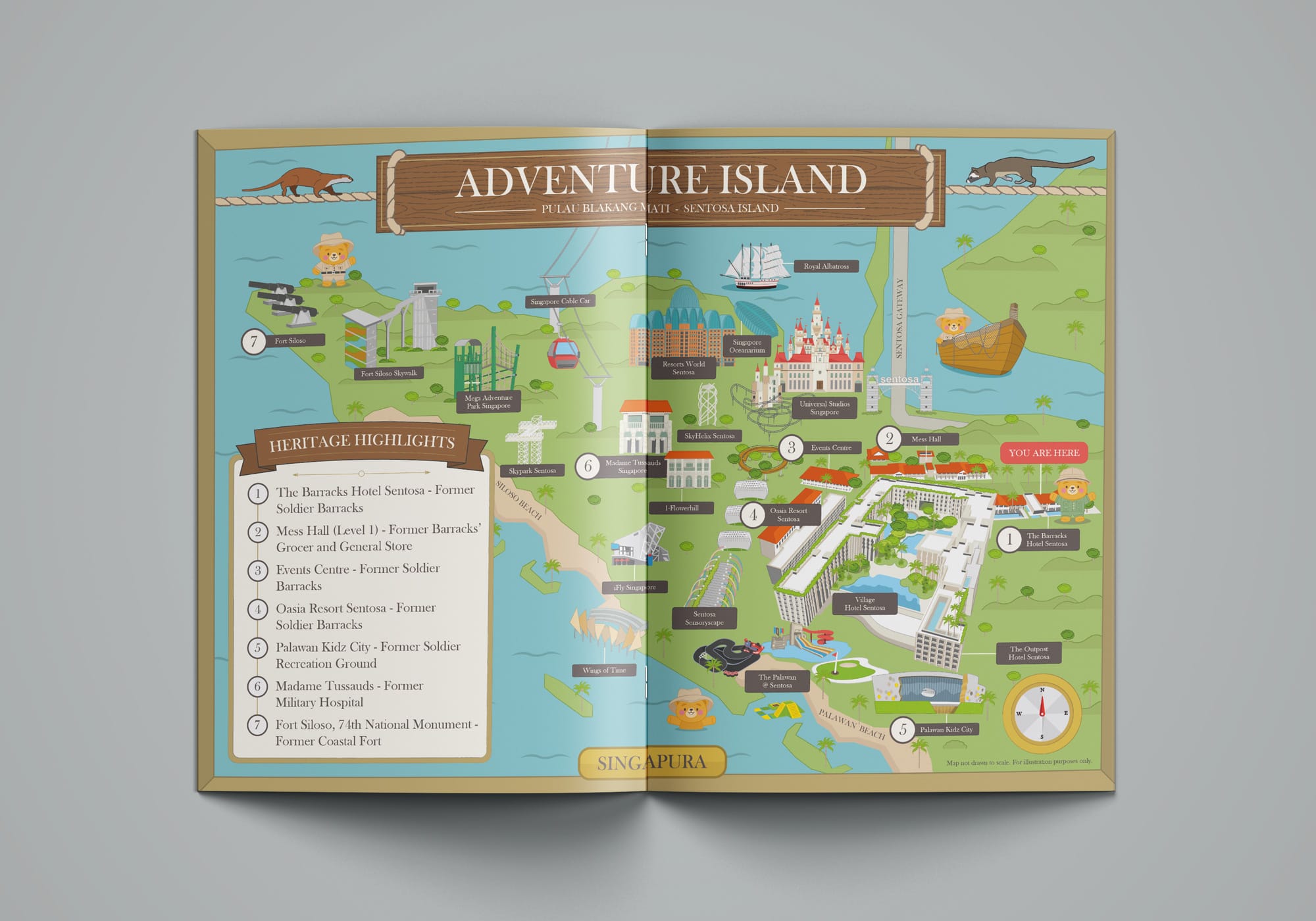 For The Barracks Hotel Sentosa, we designed an island-level map that helps children see Sentosa as more than just a resort destination—but as a place with layers of history and transformation. The map zooms out to show the whole of Sentosa Island, charting its past as a colonial military outpost filled with forts and barracks, alongside its present-day role as one of Singapore’s most iconic leisure destinations.