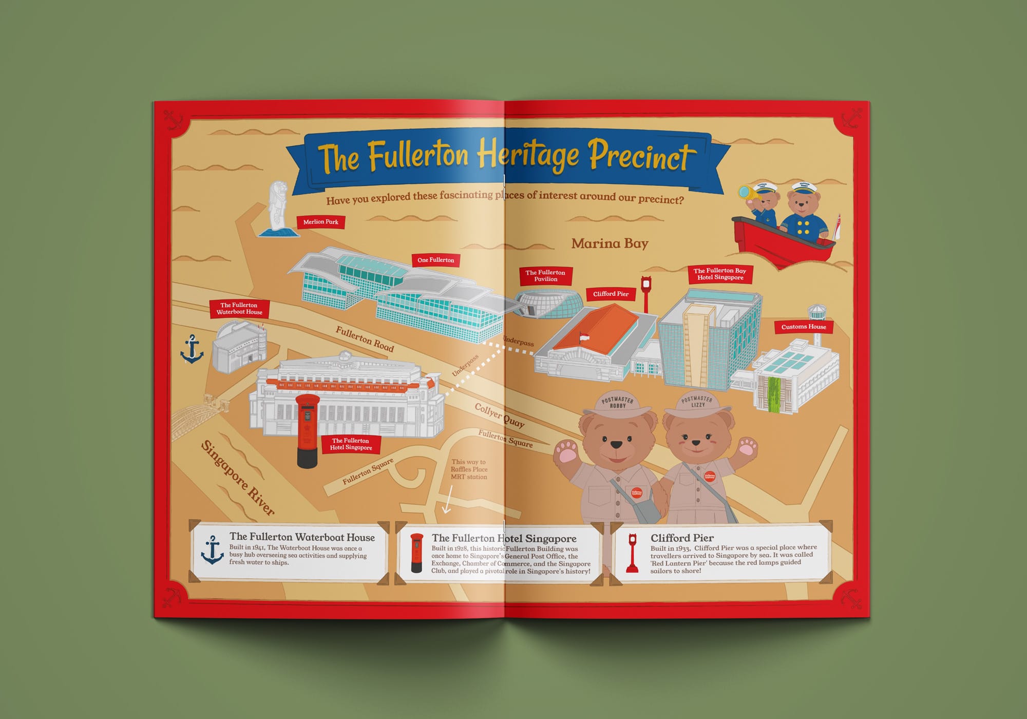 The map highlights how these historically significant sites sit within easy walking distance of one another, including the iconic Merlion. To make exploration more engaging for children, we included the hotels' adorable mascots, Robby and Lizzy, as companions on the journey. Rather than feeling like a history lesson, the map turns the neighbourhood into an open-air discovery trail—helping families understand the past, see how everything connects and feel confident exploring together.