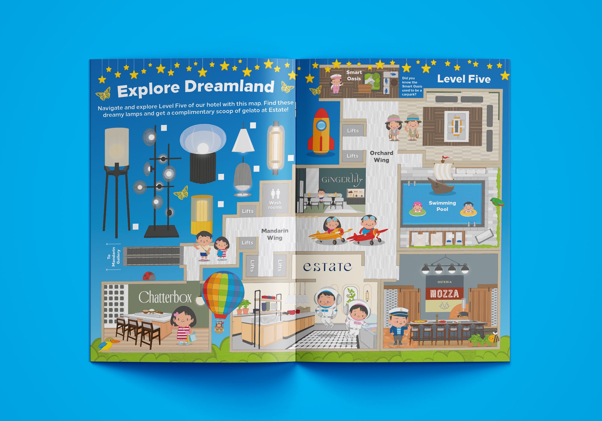 In a large city hotel like Hilton Singapore Orchard, a single floor can pack in a lot of activity. Level five acts as the heart of the hotel, bringing together restaurants, cafés, the check-in counters and the swimming pool. To help families navigate this bustling space comfortably, we created a floor-level map that clearly presents everything in a child-friendly format.
