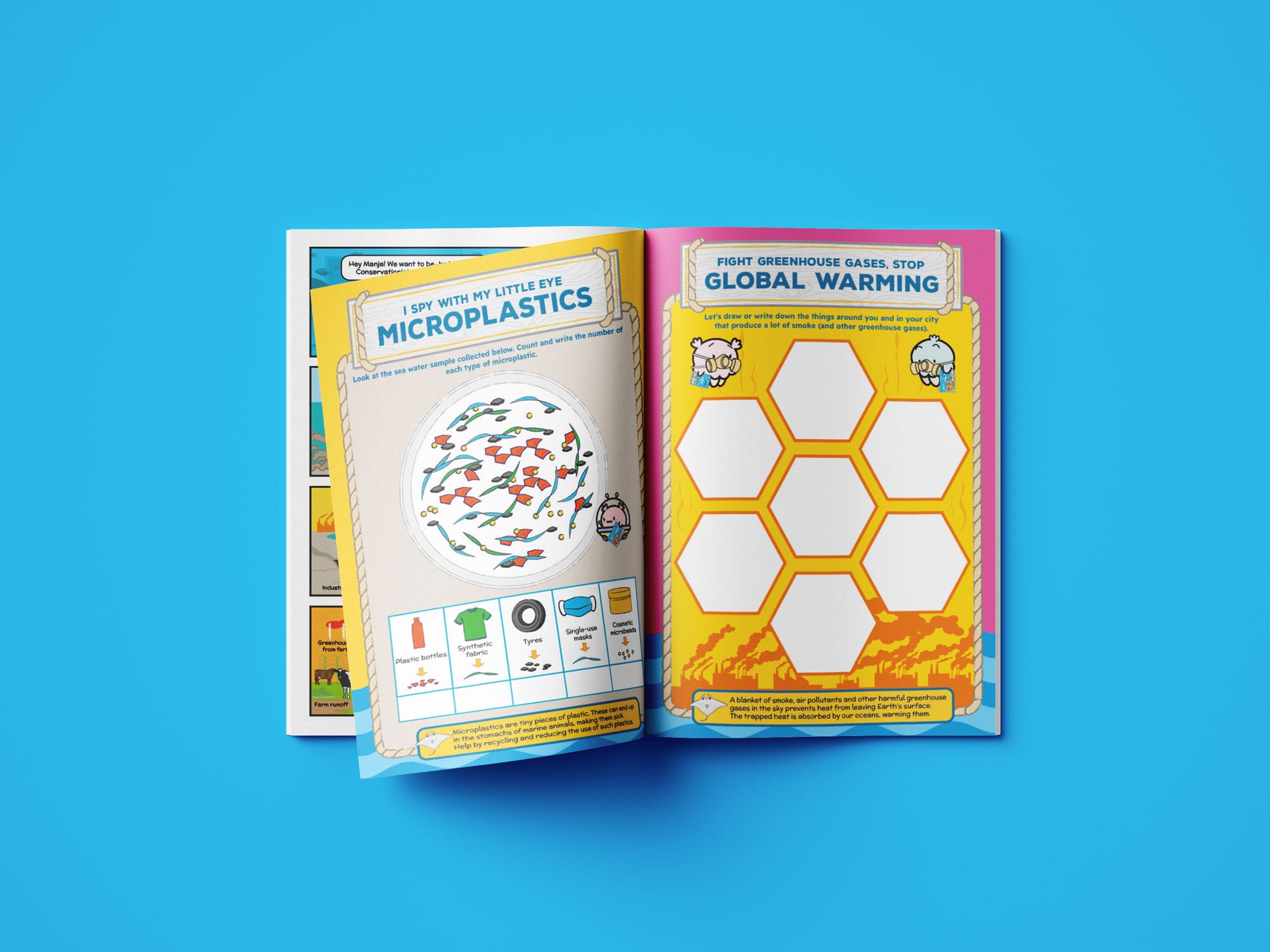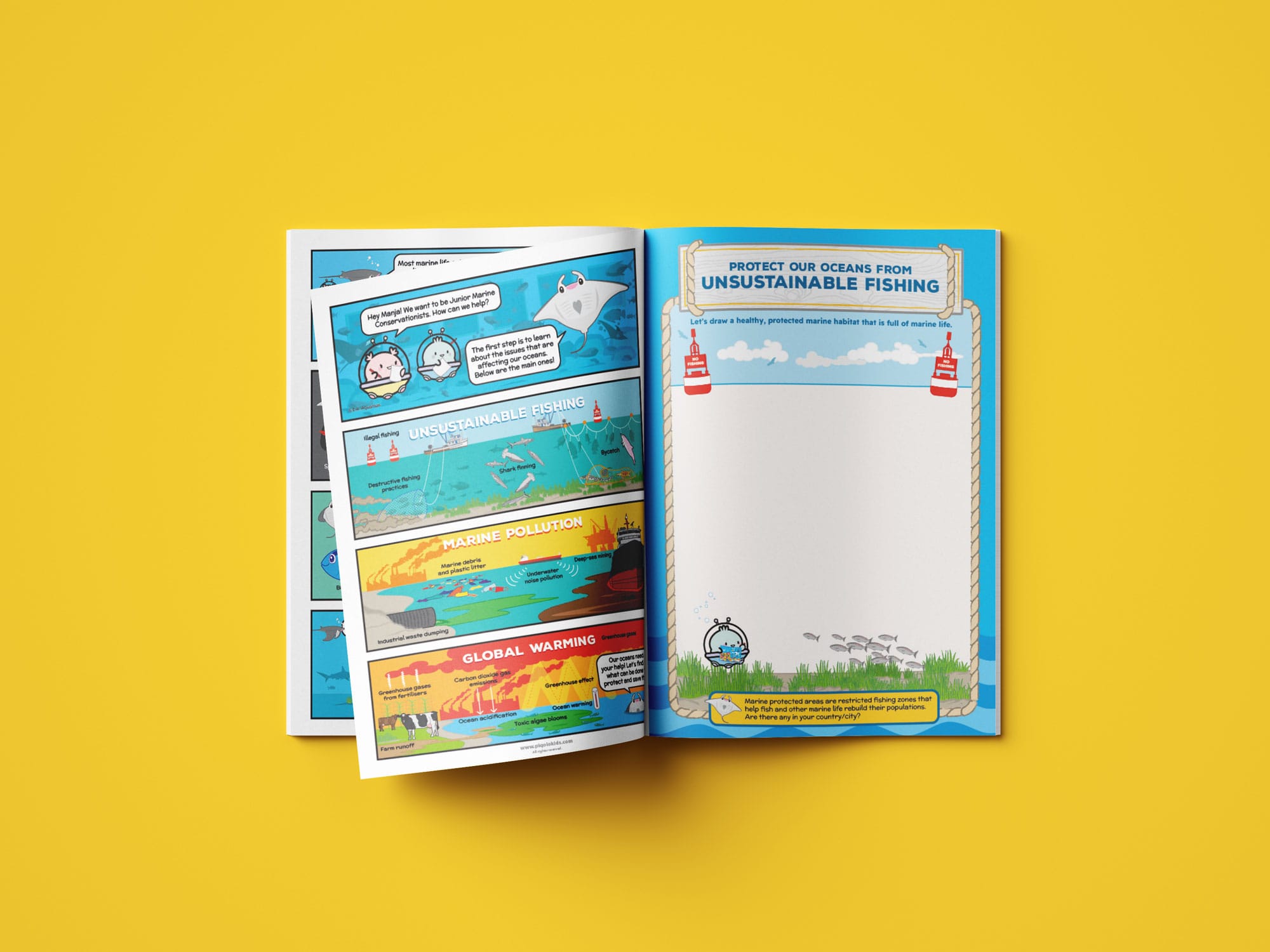 To deepen the educational value of the handbook, we wove essential ocean conservation concepts — such as unsustainable fishing, microplastics and global warming — directly into the activities. Through puzzles, drawing prompts, I spy challenges and short reflection tasks, kids learn how these threats impact marine ecosystems and why awareness (and action) matters.