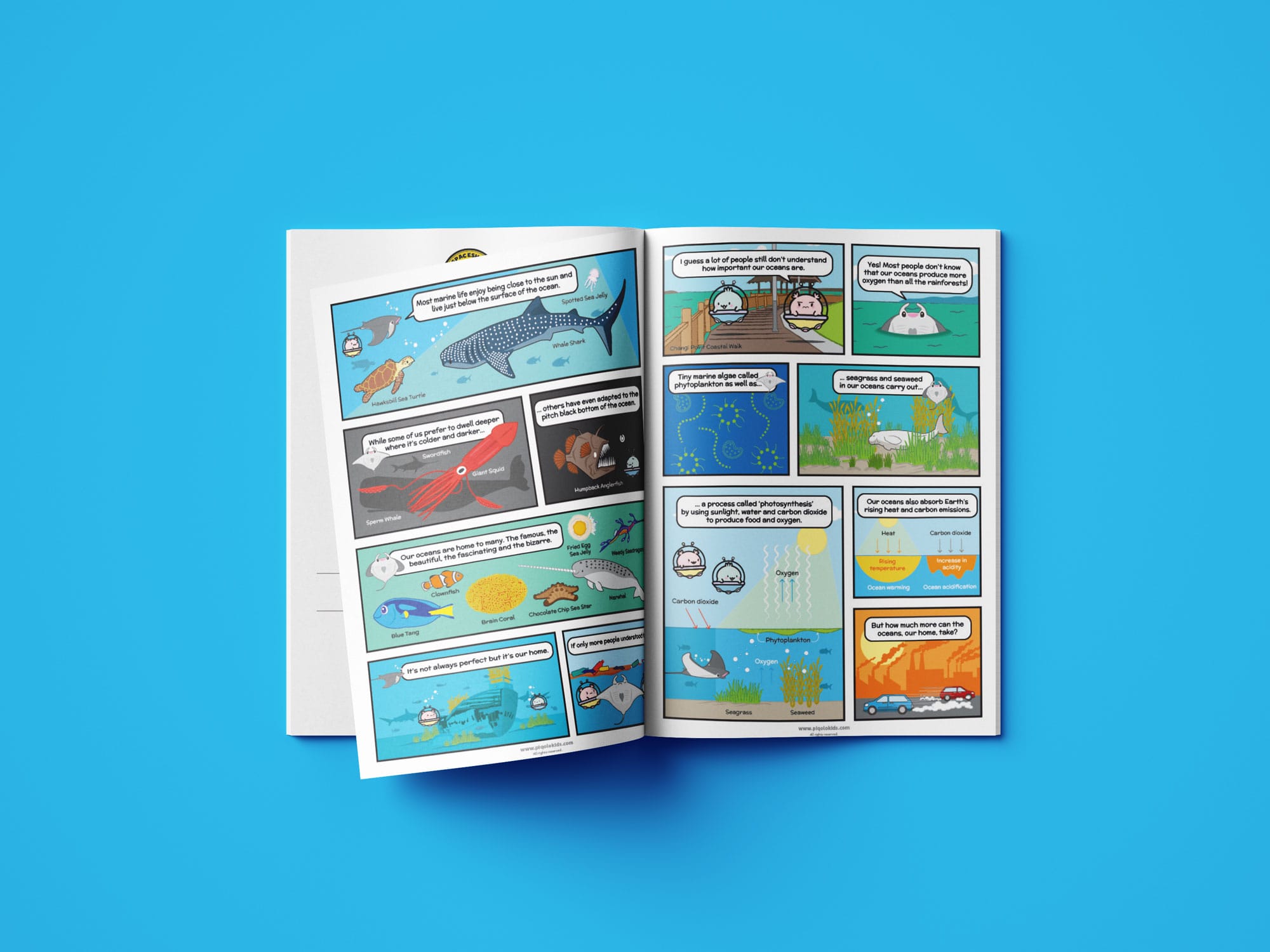 To make complex ocean concepts accessible and exciting for young learners, we introduced our in-house comic characters — Peppy and Lili, two curious alien explorers on a mission to understand Earth’s blue planet. Their journey begins with a lively four-page comic where they are greeted by Manja the Reef Manta Ray, the aquarium’s beloved mascot, who becomes their friendly guide through the wonders of the ocean. Together, they discover the five main oceans, meet different kinds of marine life, and learn how the ocean supports life on Earth.