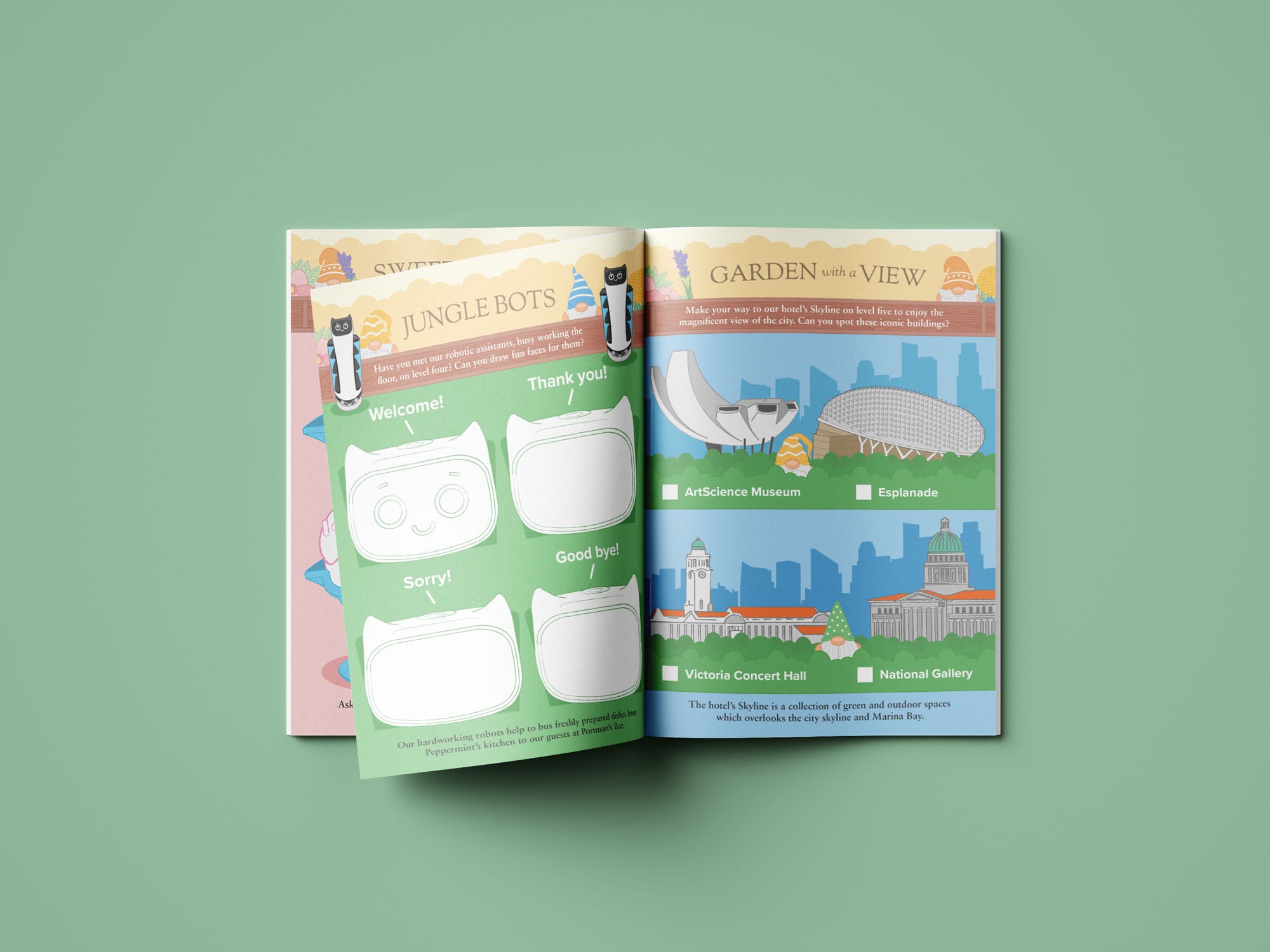 Our activity book also encourages young explorers to step outside and discover the hotel property's vibrant surroundings. We've included an activity which invites them to visit the hotel's rooftop viewing deck, where they can take in breathtaking views of Marina Bay and Singapore’s historic Civic District. It’s the perfect way to spark curiosity about the city’s iconic landmarks and rich heritage while enjoying a whole new perspective from above.