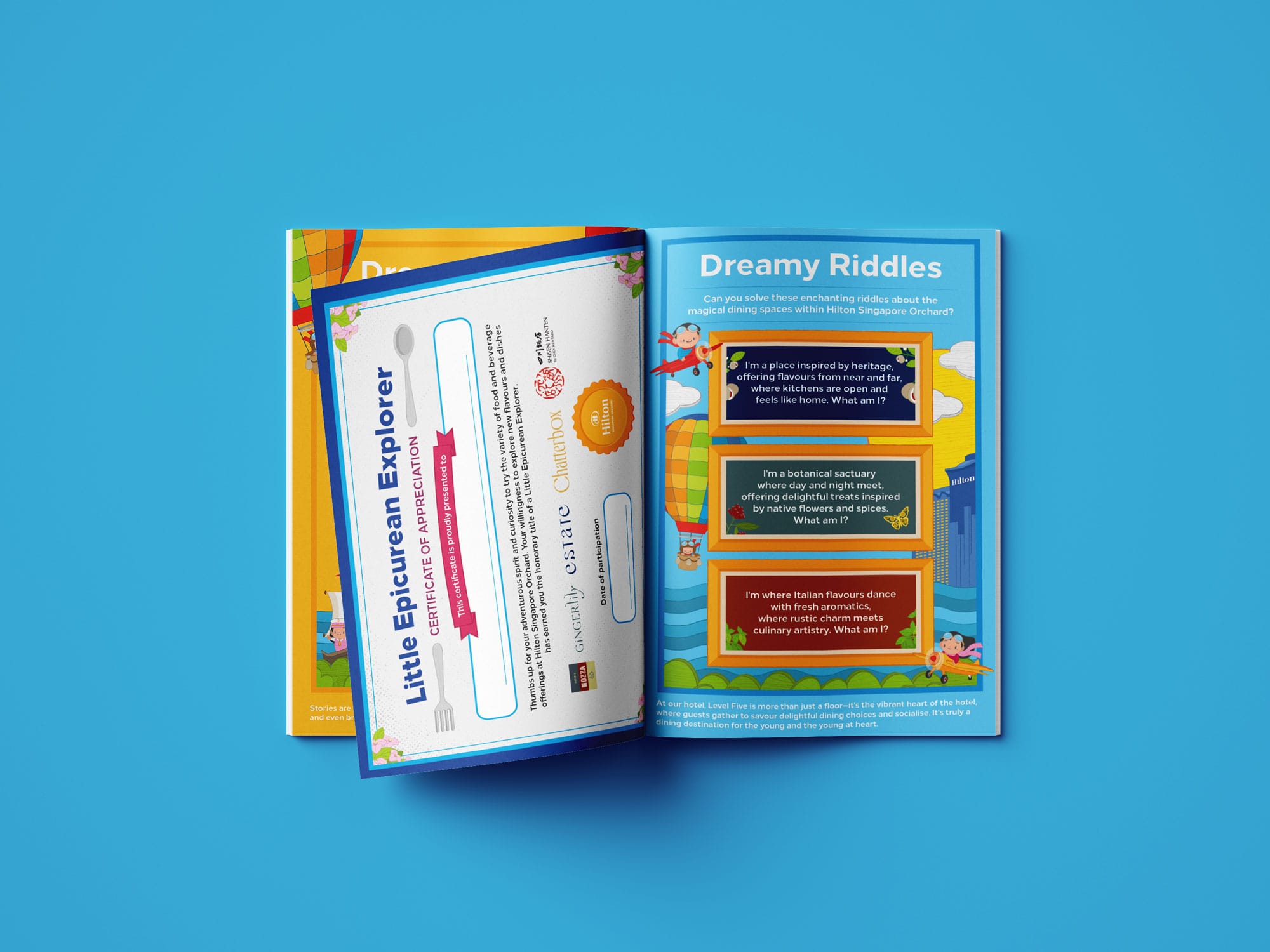 A Little Epicurean Explorer certificate celebrates their curiosity and discovery of different cuisines, making them feel like true food adventurers. For an extra challenge, a page of playful riddles invites kids to guess each restaurant, adding a touch of mystery and fun to their dining experience. Through these engaging activities, children can explore the hotel's vibrant food scene in an interactive and memorable way.